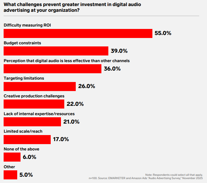EMARKETERがAmazon Adsと共同で実施した調査「A Sound Move: Marketers say digital audio is ready for bigger investment」は、米国市場のマーケター100名を対象に、デジタルオーディオ広告への投資価値に関する意識を分析したものです。この調査は、デジタルオーディオ広告が広告戦略において占める重要性が増している現状を浮き彫りにしています。